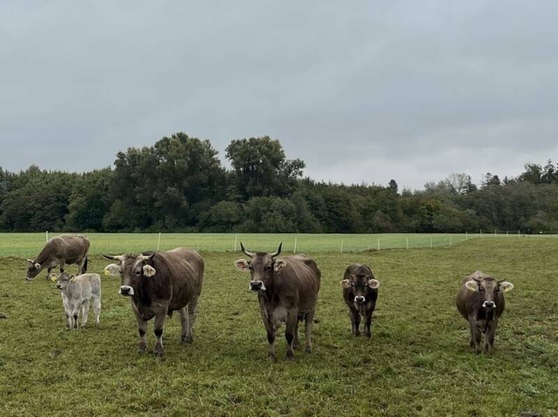 Unsere Rinder leben in einer Mutterkuhherde und sind, sofern es die Witterung zulässt, ganzjährig auf der Weide. „Mutterkuhhaltung“ bedeutet, dass die Kälber nach der Geburt nicht von ihren Müttern getrennt werden, sondern zusammen mit ihnen im Herdenverband aufwachsen. So finden sich Kälber zusammen mit älteren weiblichen und männlichen Tieren in unserer Herde. Auch unsere Rinder sind keine Hochleistungstiere, sondern gehören einer alten, einheimischen und vom Aussterben bedrohten Rasse an: Original Allgäuer Braunvieh (alte Zuchtrichtung). Unsere vergleichsweise kleine Herde beweidet mehrere Monate pro Jahr das Bergheimer Laubfroschbiotop zum Zwecke der Landschaftspflege sowie weitere extensiv genutzte Grünlandflächen in der Umgebung. Im Frühjahr und im Herbst beweiden sie auch unsere Ackerflächen, da wir als Biobetrieb ca. 40% unserer Flächen mit Stickstoff bindendem Kleegras und anderen Leguminosen eingesät haben. Je nach Fruchtfolge können unsere Rinder auf diese Weise den Acker optimal auf die Folgekultur vorbereiten.